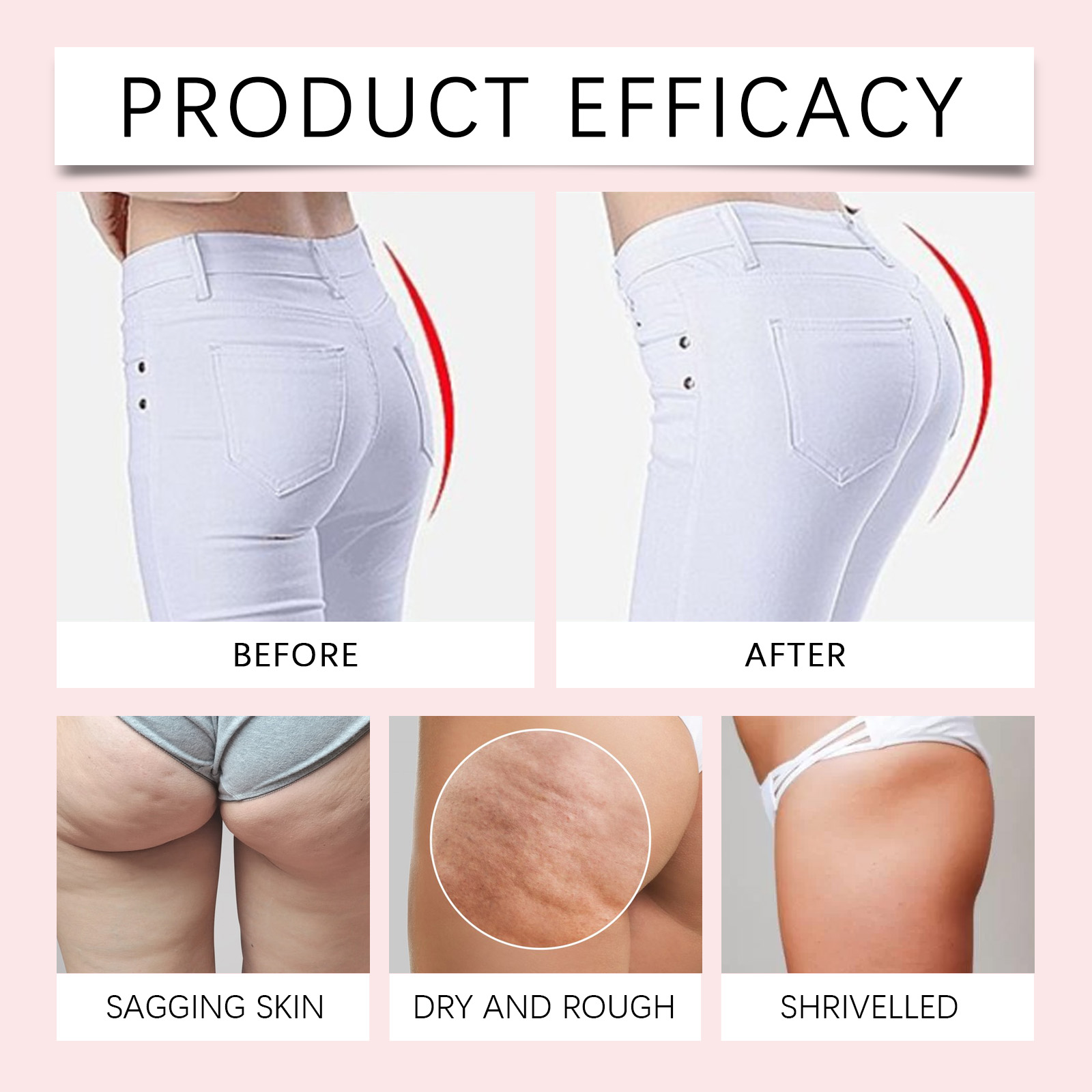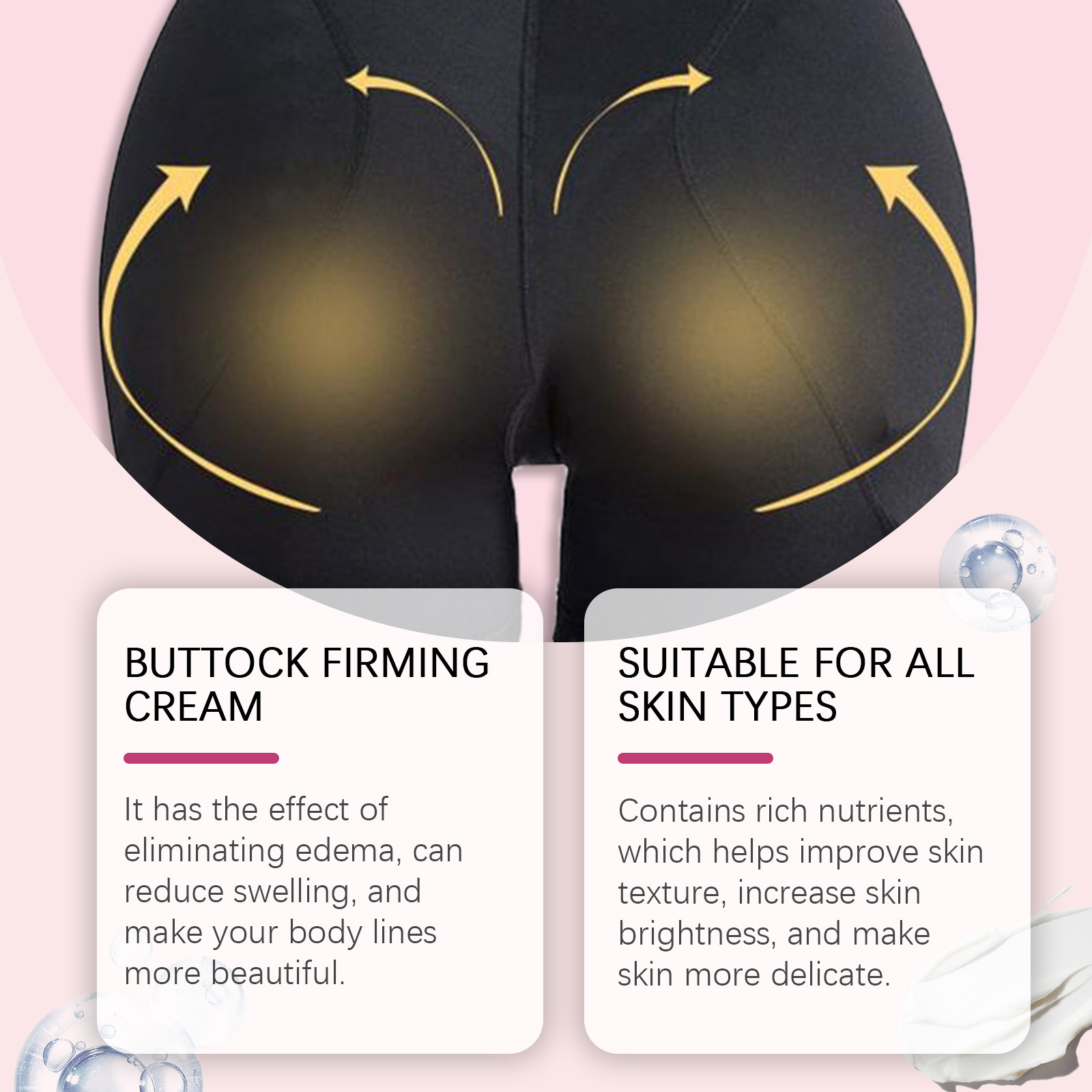 Our butt firming Lift cream contains hyaluronic acid, honey extract, Jojoba leaf extract. It can deeply moisturize, increase skin moisture content, enhance skin elasticity, and make buttock skin softer and smoother. It has the effect of tightening the skin and improving the skin firmness, making the hip line clearer and more prominent. Rich in nutrients and moisturizing factors, it moisturizes skin, increases skin elasticity, and prevents dry buttocks. Its application method is very simple: 1. Clean the buttock skin with warm water, dry it, and apply an appropriate amount of firming and lifting cream. 2. Apply appropriate amount to buttocks and massage gently in circular motion until completely absorbed. Butt firming and Lifting Cream eliminates edema, can reduce swelling and make your body line more beautiful. It is rich in nutrients. Helps to improve skin texture, increase skin brightness, make skin more delicate; Effectively burn fat, accelerate fat decomposition, reduce fat accumulation in the buttocks, and create perfect curves.
